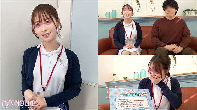 勤務中の看護師がズラ~ッと並んだチ○ポ10本の中から普段看ている患者さんを見つけ出すチ○ポ当てゲームに挑戦!当てれば大量賞金☆ハズレたらデカチン即ハメ罰ゲーム☆今回挑戦するのは、愛嬌たっぷりメチャかわナースの『まい』さん!いつもお世話をしている患者さんのお願いでチャンレンジに参加し、まずは患者さんのチ〇ポの形を覚えてもらうために目隠ししながら念入りにタッチ…肉棒達が待ち構える部屋に移動し、チ○ポ当てチャレンジスタート♪見慣れぬチ〇ポ群に動揺しながら優しい手コキで必死に担当チ○ポを探すまいさん…精子をぶっかけられながら健闘するも3回のチャンスを全て外してしまいデカチン生挿入確定!突如現れたデカチンにパコられ、「ゴメンなさい…///」と謝りながら潮吹き連続ガチイキ…罰ゲームなのに快楽に溺れながら中出し&顔射され精子まみれになっちゃいまいました☆【街角素人モニタリング】B:85 W:58 H:85※この作品は成人にコスプレをさせています。※この作品の出演者は全て19歳以上の成人です。(All performers in this work are adults over the age of 19.)